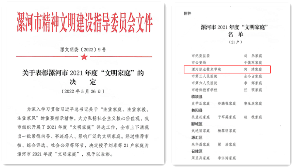 近日,漯河市精神文明建设指导委员会下发了《关于表彰漯河市2021年度“文明家庭”的决定》(漯文明委〔2022〕9号),beat365体育官网平台教职工何琦家庭被授予漯河市2021年度 “文明家庭”。